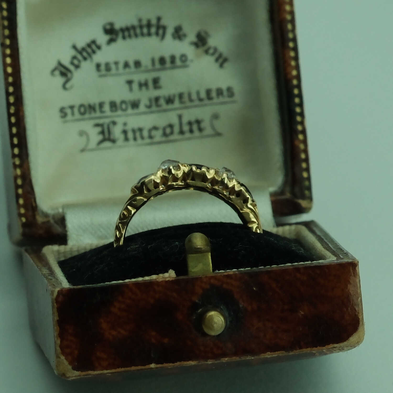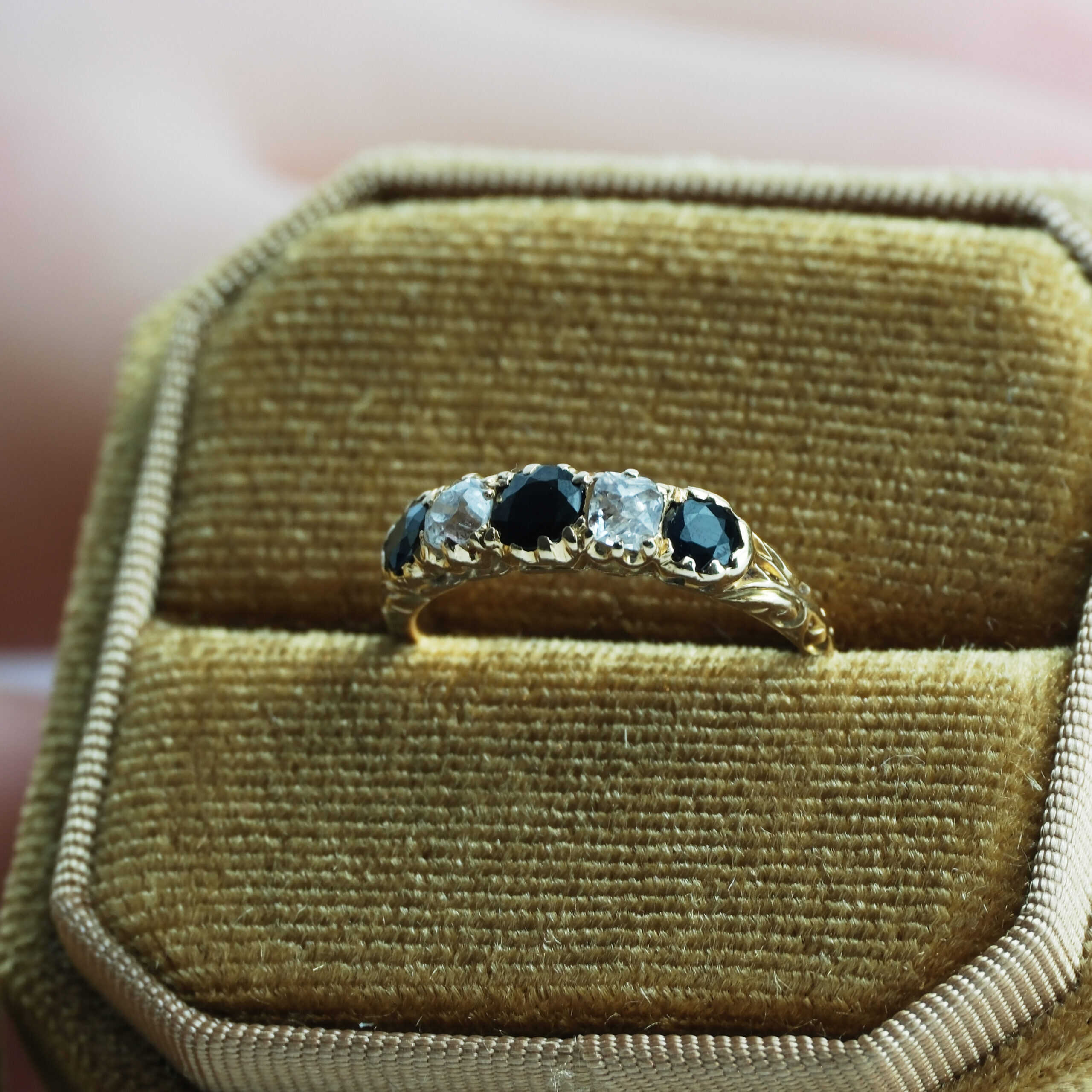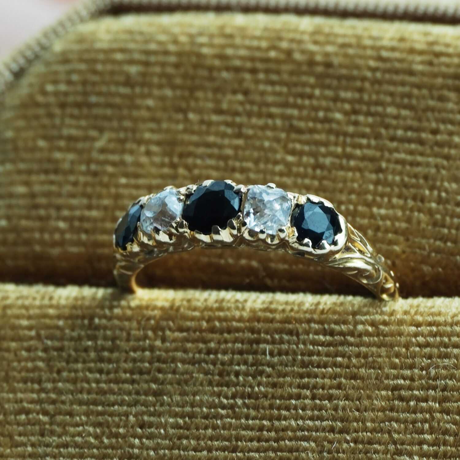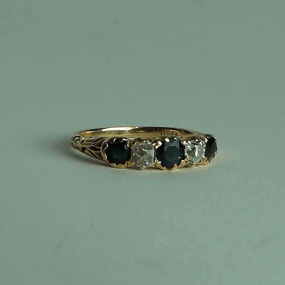 It is clearly marked 18ct and has been tested to confirm. The captivating arrangement of three vibrant sapphires and two old-cut diamonds gives the ring a classic, enduring charm. Beautifully crafted, it remains in excellent condition for its age.